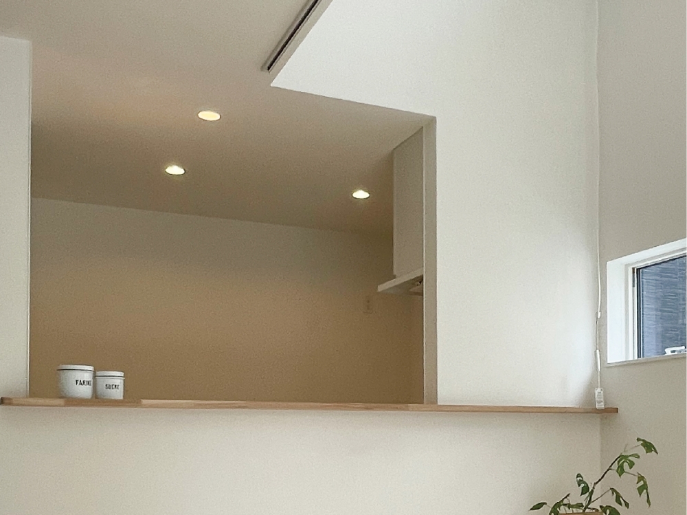 ダイニング、リビングが見渡せる対面キッチン。キッチン横には収納があり、食品の保管や調理器具の収納としても使えます。