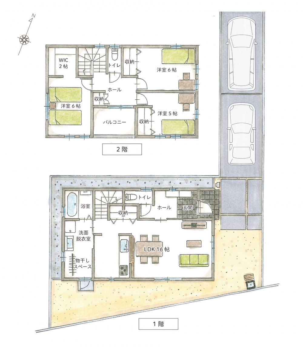 南側の敷地はお庭として十分なスペースがあり、ウッドデッキを設ければアウトドアリビングとしても楽しむことができます。(デッキは別途費用) 駐車スペースは2台分あります。